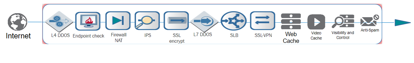 而且為了安全和合規的要求,往往會在互聯網出口區域采用“糖葫蘆串兒”的方式堆積多種安全設備,類似下面這樣的網絡部署:
