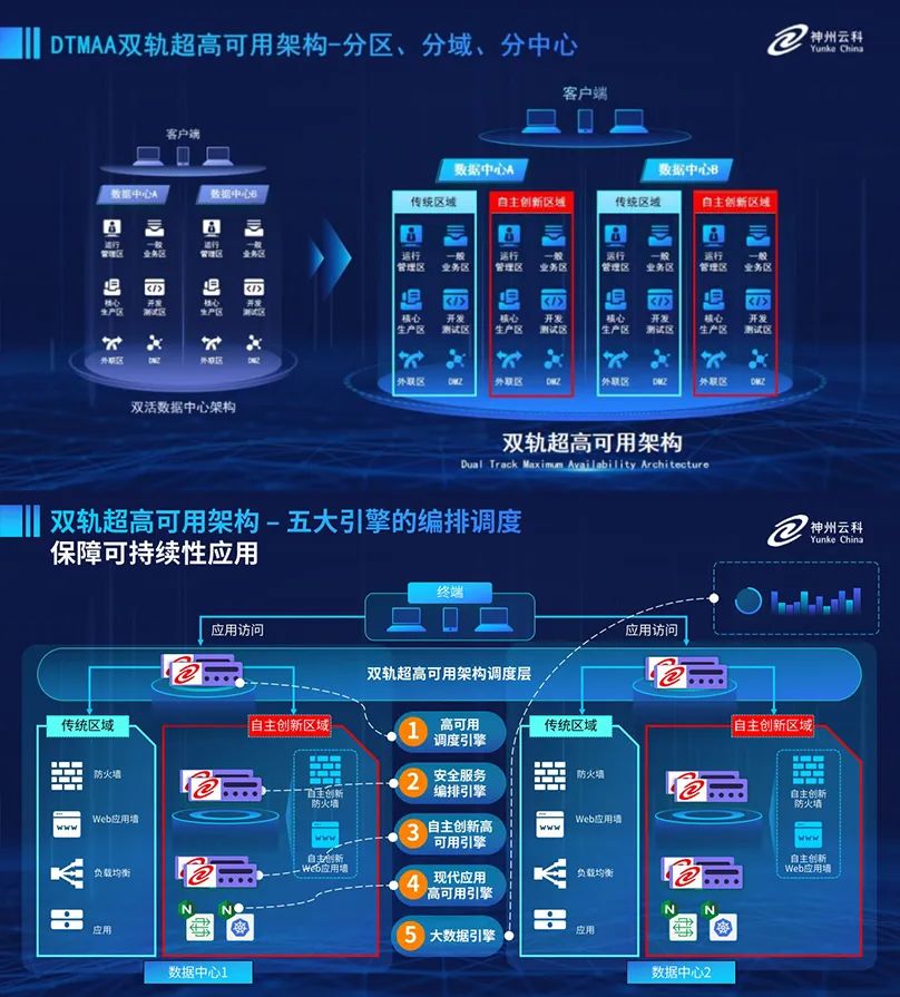 為助力銀行業務高質量發展,更好地應對數字經濟時代對可持續性的高要求,實現“信創”與“數字化”齊頭并進,leyu.樂魚創新性的推出了雙軌超高可用架構。該架構在雙活數據中心的分區調度基礎上,增加信創域和非信創域的分域調度,實行信創域與傳統域應用全量部署,使雙中心運營變為雙中心四區域并行運行,互為多活,將“0到1”的單軌建設道路變為分區分域協同的多活雙軌超高可用架構。幫助客戶在新架構下,保障“信創”的同時解決性能瓶頸,提升穩定性,保證應用可持續性,最終實現信創區域和非信創區域的平滑過渡,完成國產化替代目標。